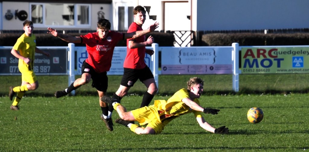 At Waterwells, Quedgeley Wanderers produced a strong all-round performance to secure a convincing 4-1 victory over Broadwell Amateurs. The hosts started the match brightly and almost took a ninth minute lead when Fin Jenner latched onto a Dylan Venn clearance, rounded Jack Watkins but dragged his effort wide. Broadwell responded with physical intensity but it was Quedgeley who continued to press, with Stokes and Jenner both forcing corners. The breakthrough for QW arrived on the half-hour mark from a corner superbly delivered by Riley Stokes with Henry Miles rising highest at the back post to head Quedgeley into a deserved lead. However, the advantage was short-lived as a sloppy touch at the back left Broadwell’s Jamie Belfitt through on goal and he calmly lifted the ball over Kieran Derbyshire for 1-1. Quedgeley responded well and after Fin Jenner had pulled a good chance wide of the goal he made amends, when picked out by Alfie Pledgers excellent 40-yard pass, rounding Watkins to confidently finish and restore the lead. And, it was only moments later when Henry Miles was fouled inside the box allowing Venn to cooly convert the resultant spot-kick. After half time Broadwell looked to get back into the game and had a free kick narrowly wide and forced a good save by Derbyshire from a goalmouth scramble. But as the game wore on Quedgeley generally remained in control and despite ten minutes in the sin-bin for Venn and Broadwell picking up a couple of yellows in frustration they were able to see the game out. The result was sealed in the 86th minute when Oli Barnett’s cross was headed back into the danger area and Miles showed great footwork to twist and fire the ball into the top-corner for 4-1, giving Quedgeley a comfortable and deserved victory.